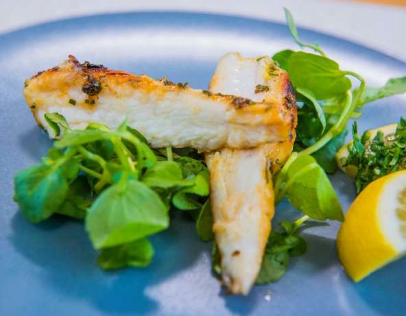 4 - Lift onto a bed of watercress and spoon any cooking juices over the top. Serve with lemon wedges