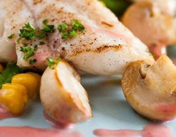 5 - To serve, spoon the sweetcorn and green beans into the centre of 4 plates. Top with the turbot, place the mushrooms around the side and spoon over the sauce. Garnish with parsley and serve.